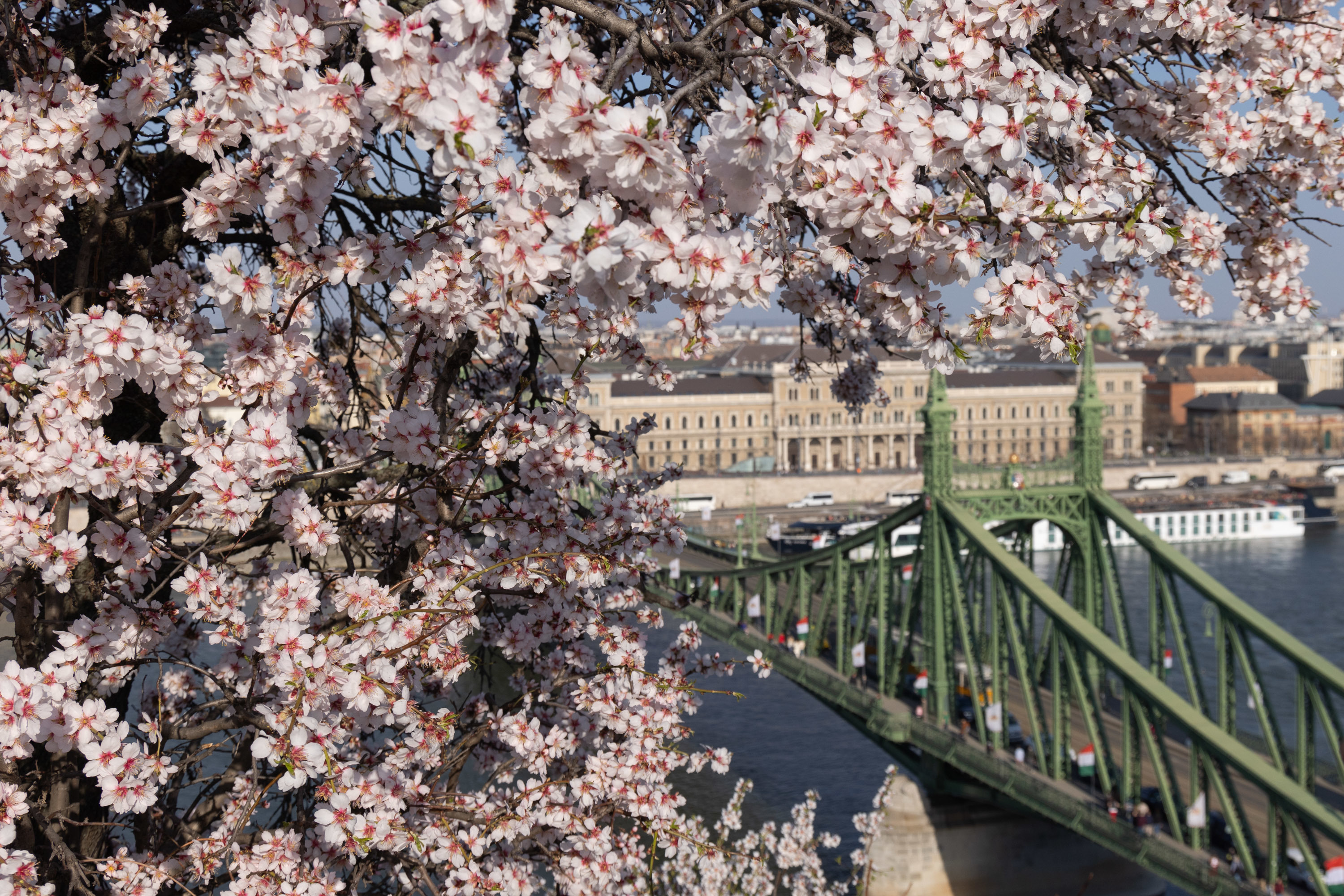 近日,匈牙利王人门布达佩斯格列尔特山上杏花绽开,诱骗繁多游东说念主前来不雅赏。