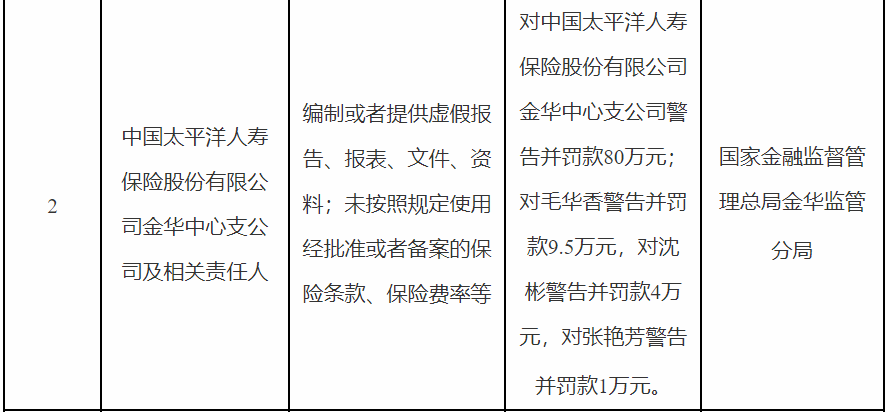 8月8日,国度金融监督处理总局金华监管分局行政处罚信息公开表显露,中国太平洋东说念主寿保障股份有限公司金华中心支公司及有关牵累东说念主因编制八成提供造作讲解、报表、文献、贵府;未按照规章使用经批准八成备案的保障要求、保障费率等被提醒并罚金80万元,对毛某提醒并罚金9.5万元,对沈某提醒并罚金4万元,对张某提醒并罚金1万元。