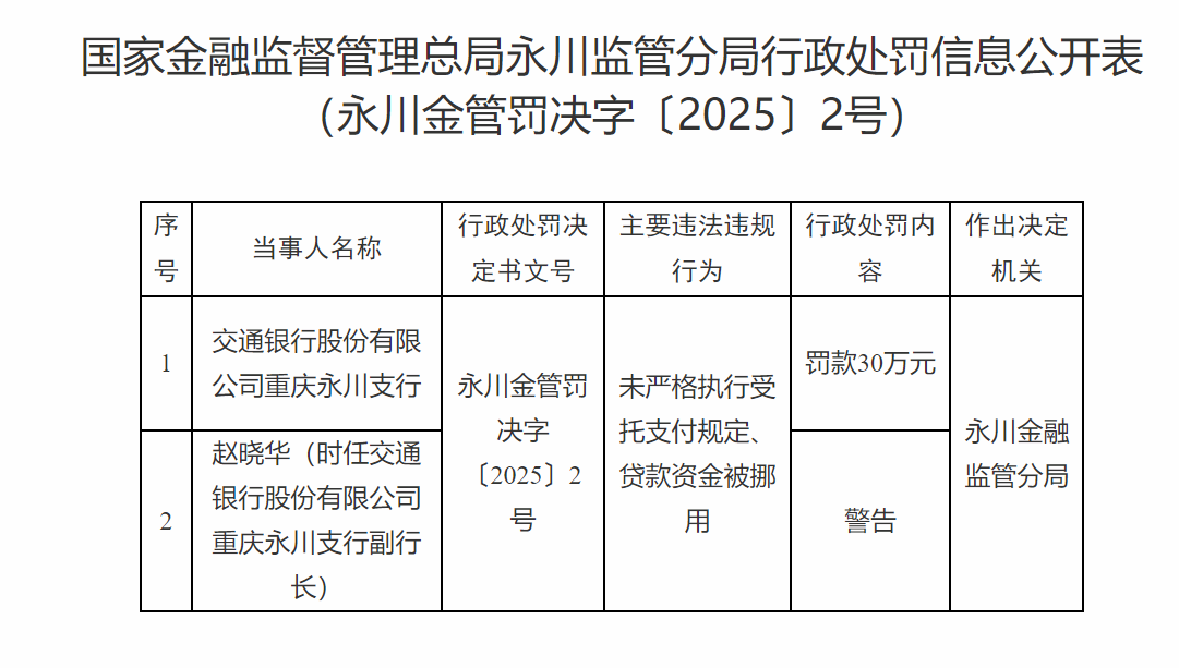 8月8日,国度金融监督处治总局永川监管分局行政处罚信息公开表败露云开体育,交通银行股份有限公司重庆永川支行及关系庄重东谈主因未严格执行受托支付顺次、贷款资金被挪用被罚金30万元,赵某被告戒。