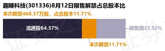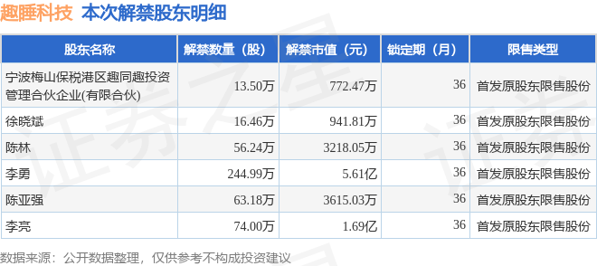 证券之星音讯,字据市集公开信息整理,趣睡科技(301336)于8月12日将有468.37万股限售股份解禁,为公司首发原激动限售股份,占公司总股本11.71%。(本次数据字据历史公告整理得出,本色情况以上市公司最新公告为准)本次解禁后,公司还有956.97万股限售股份,占总股本23.92%。具体如下图所示: