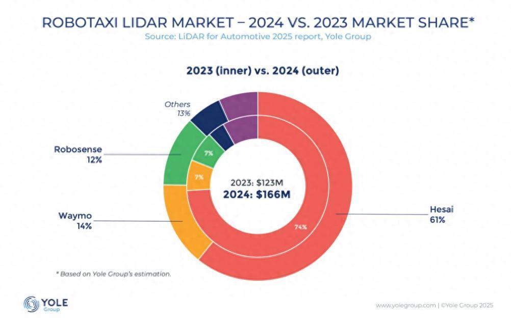 在2025年之前的试运营阶段,Robotaxi的中枢任务是技能考据与数据积蓄。尽管机械式或早期半固态激光雷达本钱腾贵,但为了追求极致的感知性能与可靠性,头部运营商大王人吹法螺承担。禾赛科技的早期居品如Pandar64等,胜利切入Robotaxi市集,取得了极高的毛利。天然遭遇速腾聚创车规级居品的竞争,但据yole呈文,2024年仍占据了该市集超60%的份额,成为robotaxi试点测试阶段的主导者。