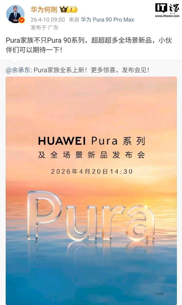 IT之家凝视到,华为 Pura 系列及全场景新品发布会昨日官宣定档 4 月 20 日 14:30。据华为末端 BG 首席施行官何刚败露,Pura 眷属不单 Pura 90 系列,超多全场景新品不错期待一下。从何刚的发言不丢脸出,华为 Pura 眷属有望带来更多惊喜。